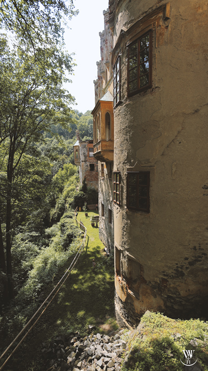- Charakter: mittelalterliche Burg mit späteren Umbauten und einem neogotischen Schlossanteil; liegt markant auf einem felsigen Vorsprung.